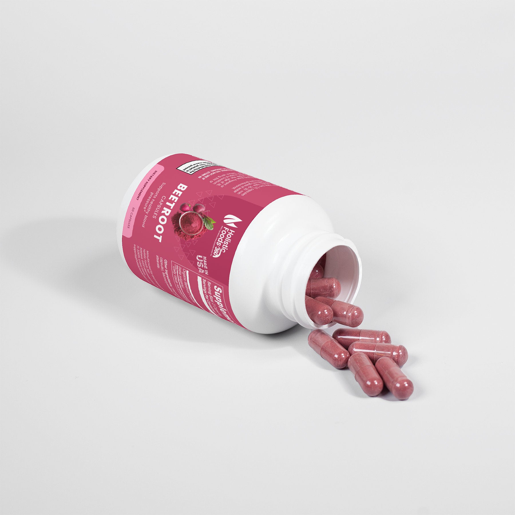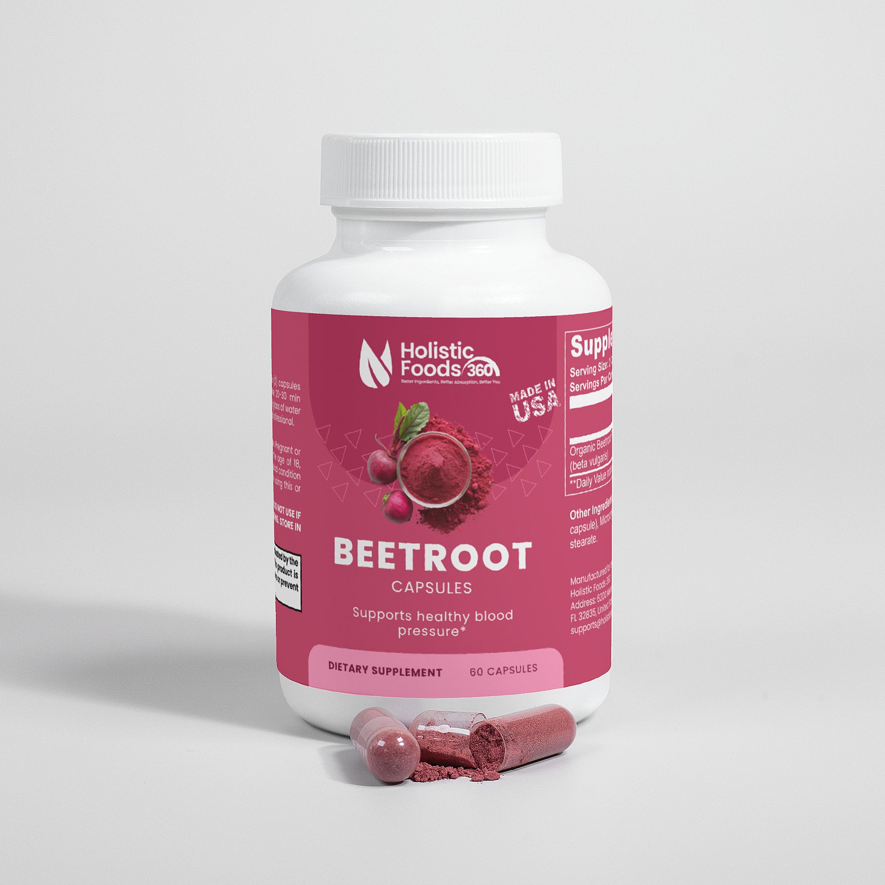 Ingredients: Organic Beetroot Powder (beta vulgaris), Hypromellose (vegetable capsule), Microcrystalline Cellulose, Magnesium Stearate.