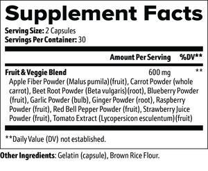 Ingredients: Apple Fiber Powder (Malus pumila) (fruit), Carrot Powder (whole carrot), Beet Root Powder (Beta vulgaris) (root), Blueberry Powder (fruit), Garlic Powder (bulb), Ginger Powder (root), Raspberry Powder (fruit), Red Bell Pepper Powder (fruit), Strawberry Juice Powder (fruit), Tomato Extract (Lycopersicon esculentum) (fruit), Gelatin (capsule), Brown Rice Flour.