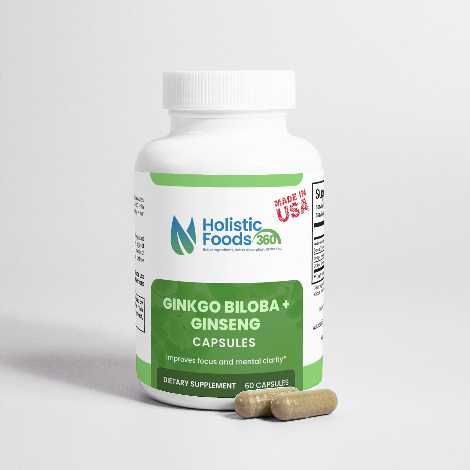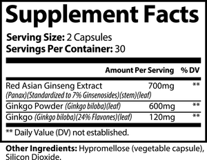 Ingredients: Red Asian Ginseng Extract (Standardized to 7% Ginsenosides)(stem)(leaf), Ginkgo Biloba Leaf Powder, Ginkgo Biloba Leaf 24% Flavones, Hypromellose (vegetable capsule), Silicon Dioxide.